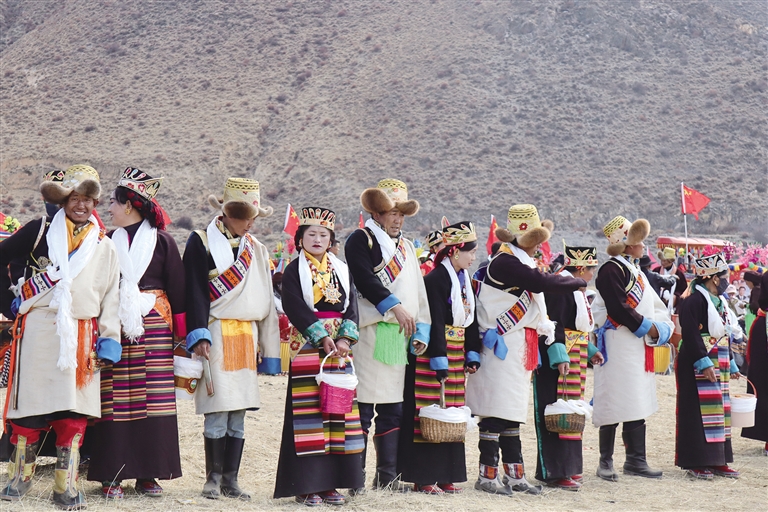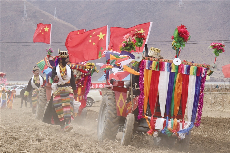 一大早,村民们头戴藏式金花、身着氆氇藏装、手捧洁白的哈达、背着自家酿造的青稞酒,一路有说有笑地来到田间,等待春耕仪式开启。不远处,一阵轰鸣声传来,扭头望去,一辆辆大红色拖拉机正有序驶来,此时的拖拉机轰鸣声犹如喷薄而出的生命力,展现出无尽的希望。