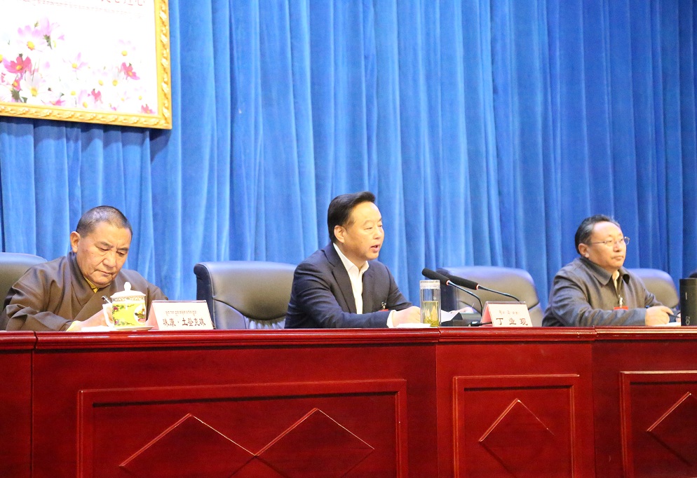 丁业现代表自治区党委、政府,代表吴英杰书记、齐扎拉主席向会议的召开表示热烈祝贺,向与会的各位理事,并通过他们向全区所有藏传佛教界爱国人士致以诚挚问候。丁业现指出,西藏佛协第十届理事会以来,在以习近平同志为核心的党中央亲切关怀下,在中国佛教协会的有力指导下,在自治区党委、政府的坚强领导下,团结带领全区宗教界人士、寺庙僧尼和信教群众自觉接受党和政府的领导,全面贯彻落实党的宗教工作基本方针,坚持藏传佛教中国化方向,主动参与加强和创新寺庙管理,坚决与达赖集团开展针锋相对斗争,寺庙僧尼和信教群众思稳定、求发展、盼和谐,从“要我稳定”向“我要稳定”转变,取得了显著成绩。